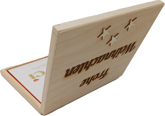 Holz Geschenkbox,Frohe Weihnachten" mit Gravur + Merci Schokolade Set Edle Holzbox mit Lasergravur Süßes Präsent für Familie, Freunde, Kollegen & Mitarbeiter Geschenk Weihnachten